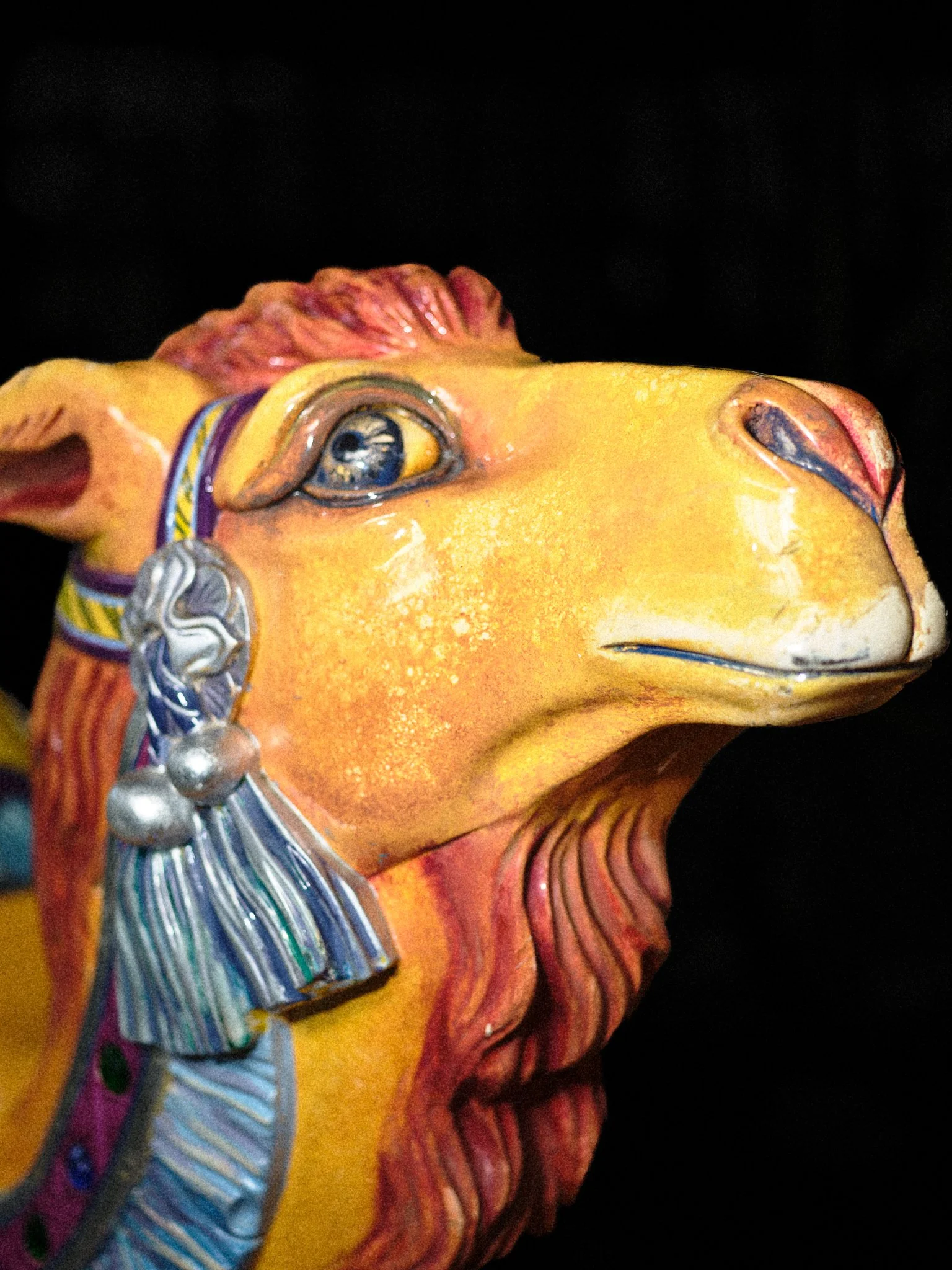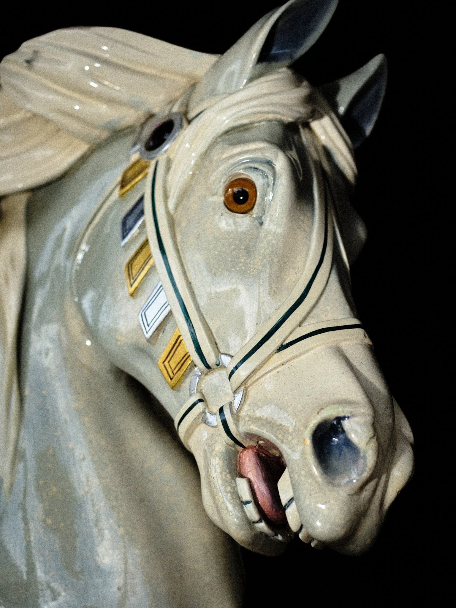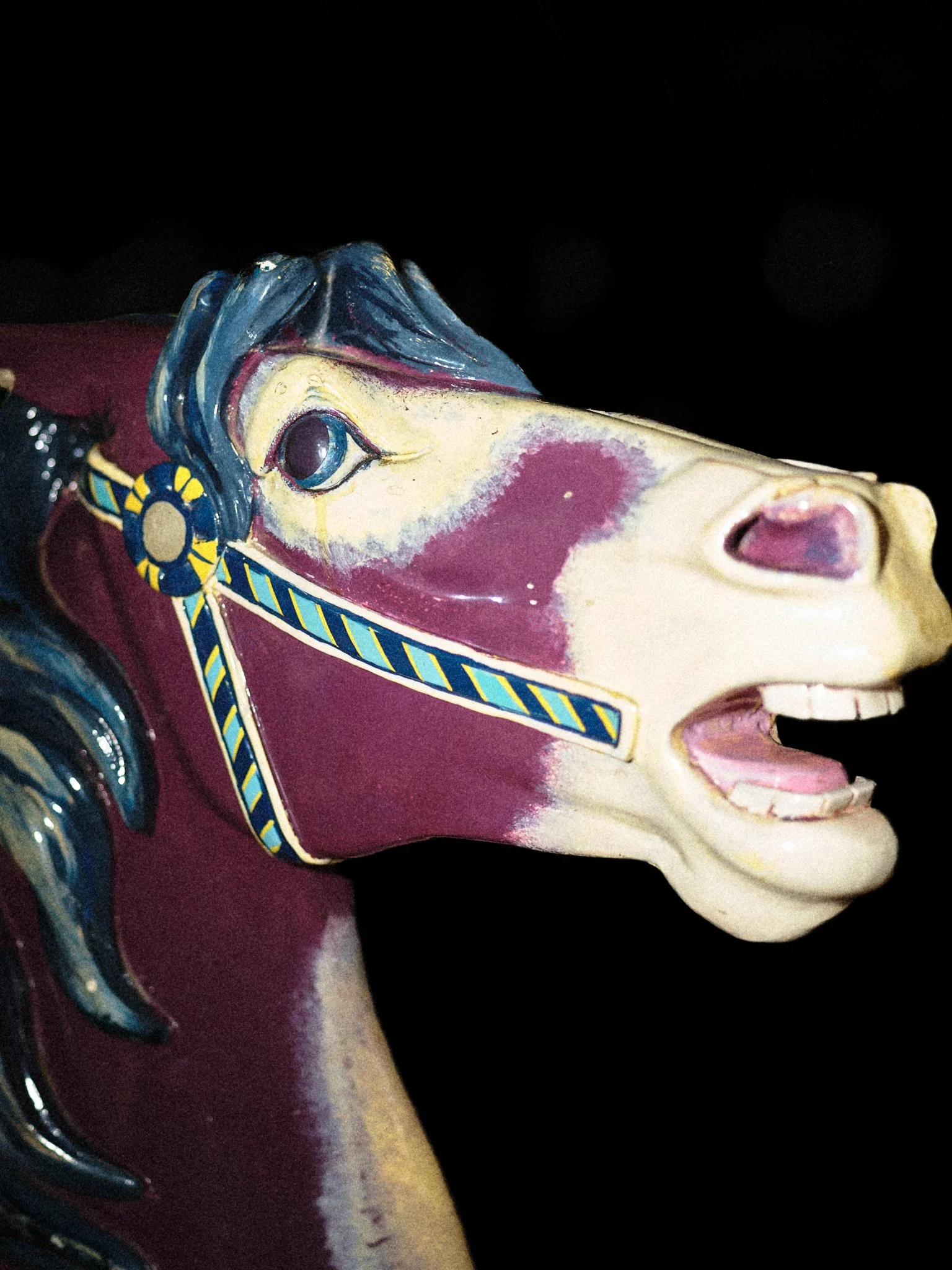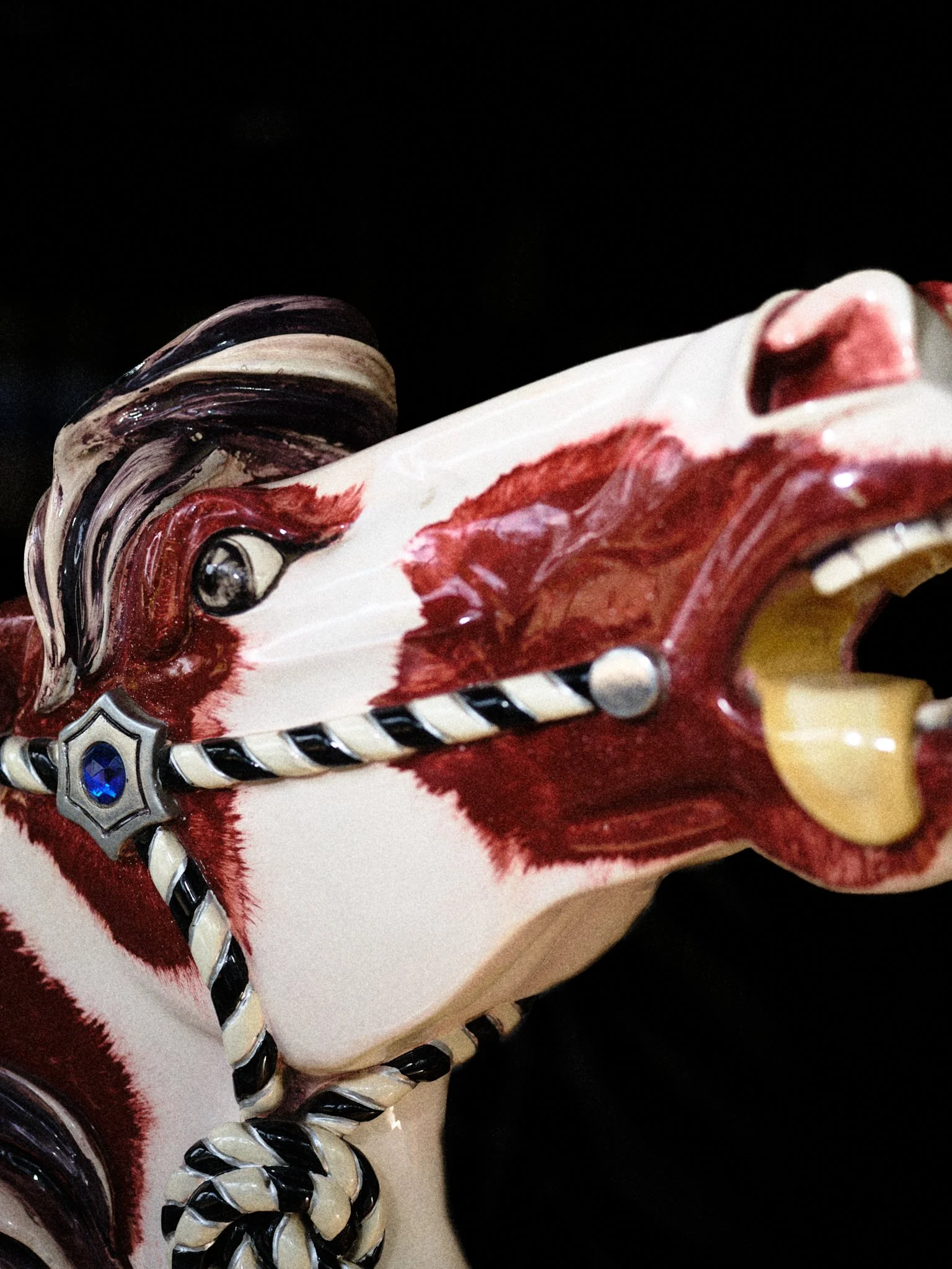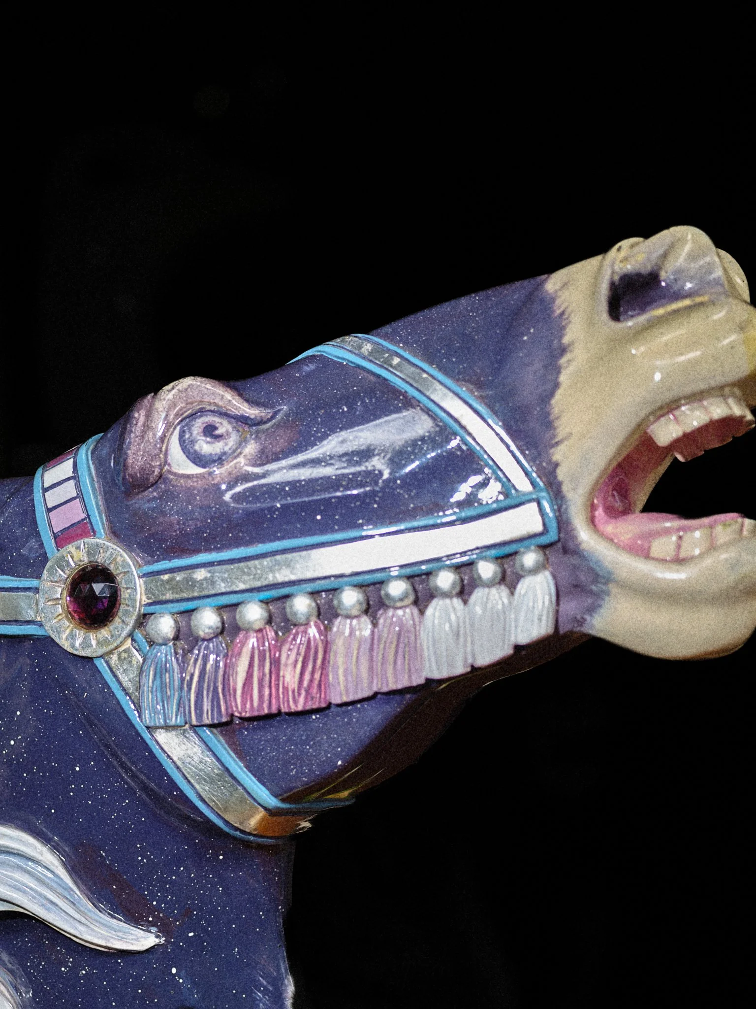 Carousels originated in 12th-century military training, the carosellos or "little wars," where knights practiced combat through competitive spectacle. By the 19th century, these machines had been rebranded for pleasure, their surfaces glazed in saturated pigments and their expressions fixed in theatrical panic. This project explores the tension between the carousel’s festive facade and its aggressive martial history. By focusing on the "Philadelphia Style" of carving, which is characterized by flared nostrils and wide eyes, these images capture animals caught in a permanent state of fight-or-flight. Isolated against a black void, the intensity of these carved forms becomes impossible to ignore, stripping away childhood nostalgia to reveal a raw, sculptural aggression.