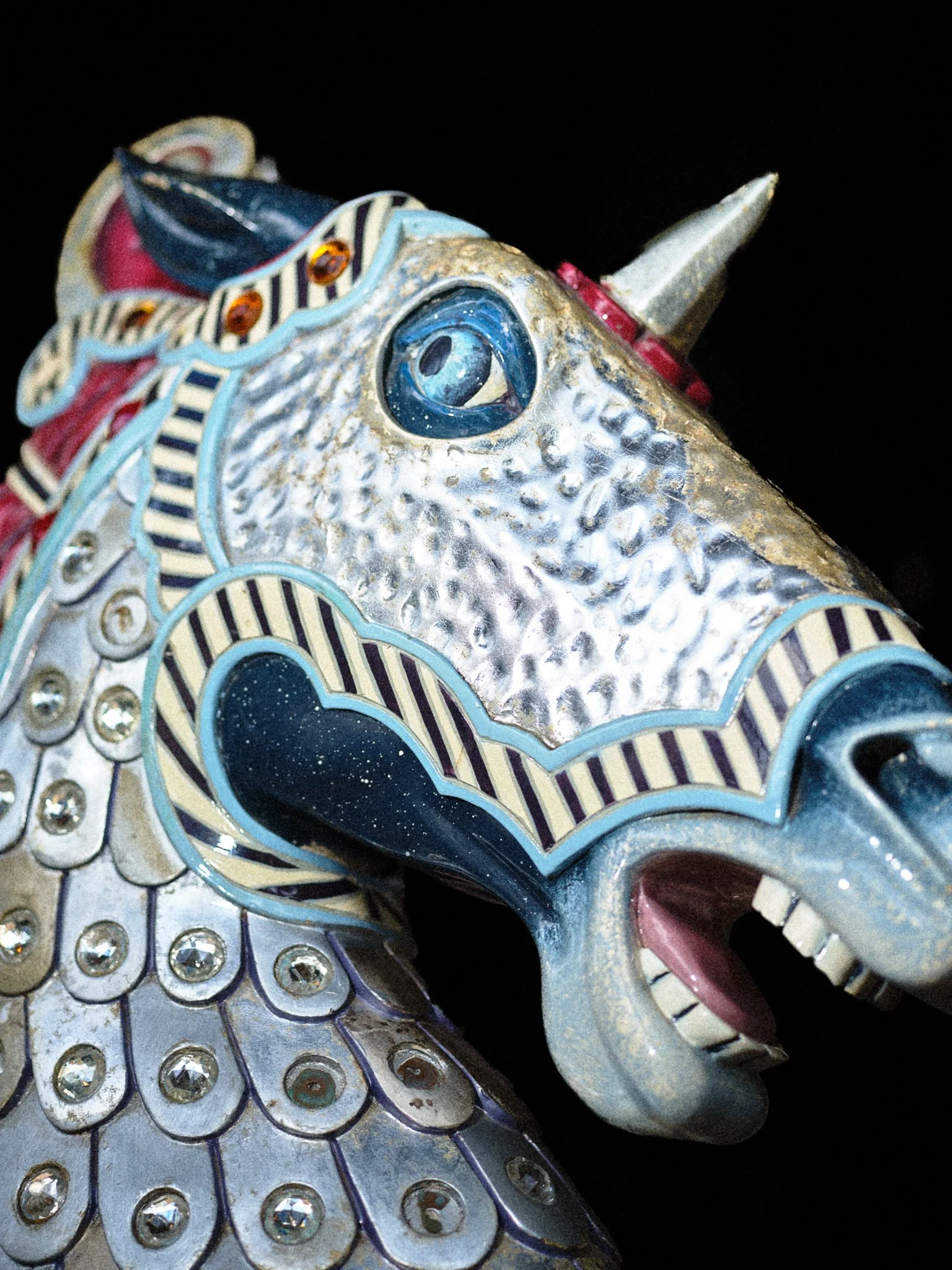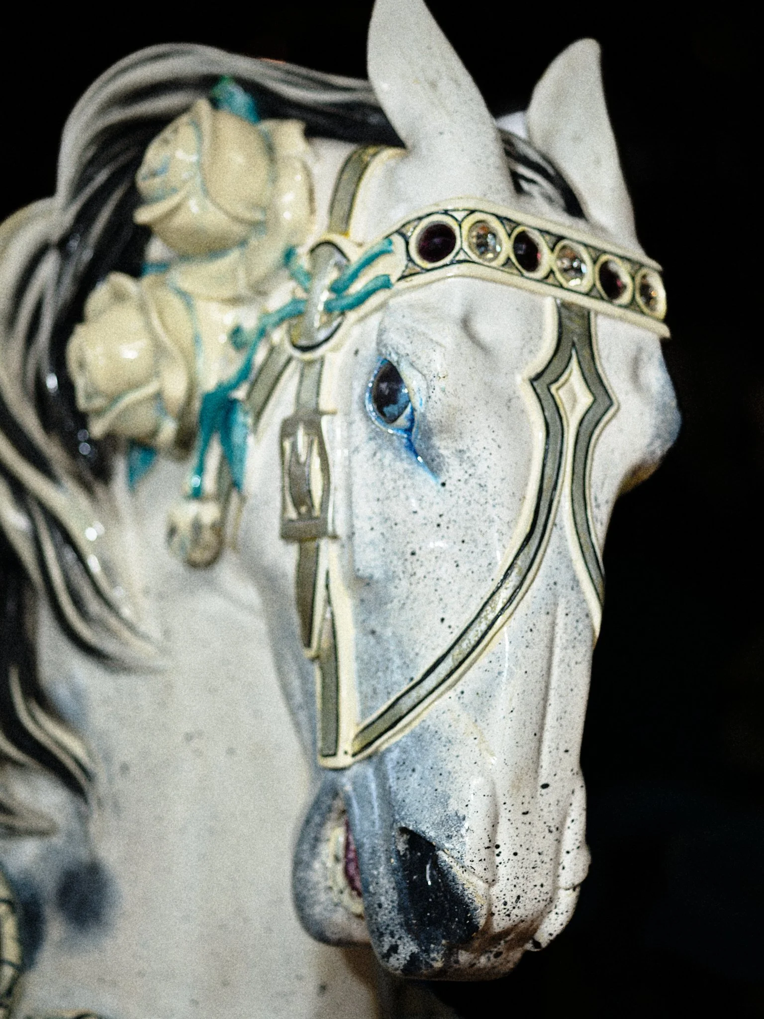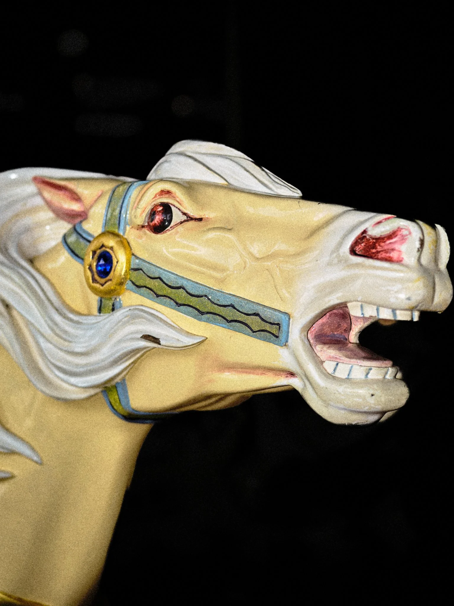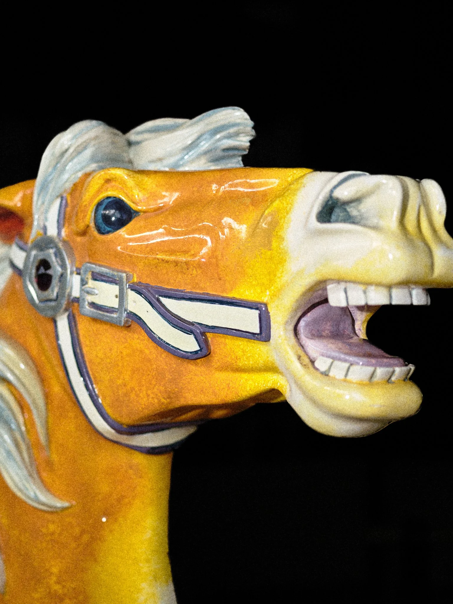 Carousels originated in 12th-century military training, the carosellos or "little wars," where knights practiced combat through competitive spectacle. By the 19th century, these machines had been rebranded for pleasure, their surfaces glazed in saturated pigments and their expressions fixed in theatrical panic. This project explores the tension between the carousel’s festive facade and its aggressive martial history. By focusing on the "Philadelphia Style" of carving, which is characterized by flared nostrils and wide eyes, these images capture animals caught in a permanent state of fight-or-flight. Isolated against a black void, the intensity of these carved forms becomes impossible to ignore, stripping away childhood nostalgia to reveal a raw, sculptural aggression.